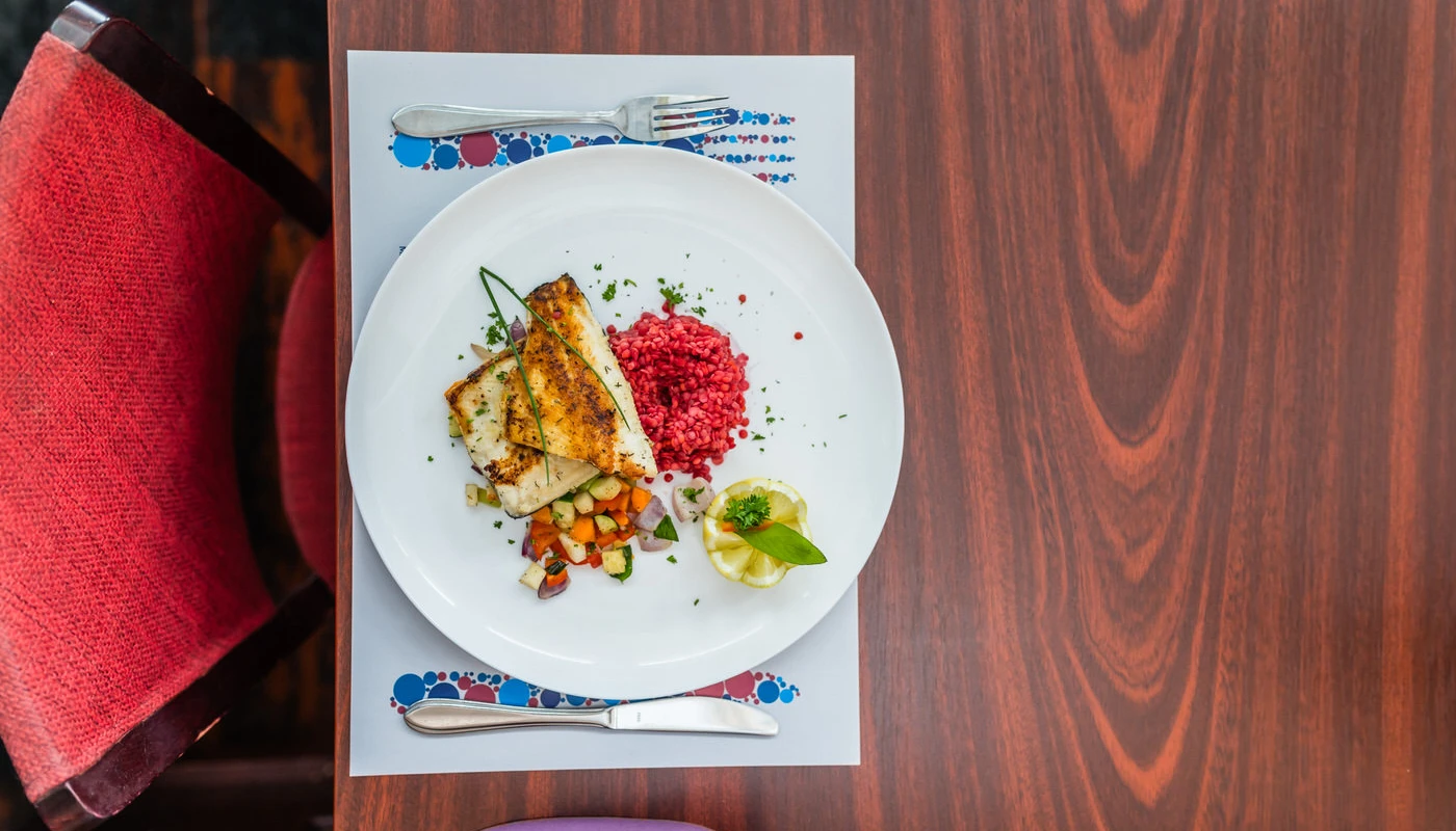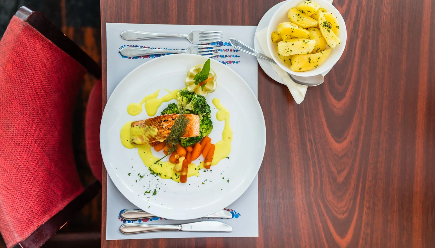 Unsere Köche bereiten schmackhafte und gesunde Gerichte mit überwiegend frischen Zutaten zu. Wir bauen Kräuter in unserem eigenen Garten an. Im Hotel können Sie ein reichhaltiges Frühstücksbuffet, Mittag- und Abendessen genießen, indem Sie aus der Speisekarte wählen. Das Hotel bietet auch à la carte Speisen an.